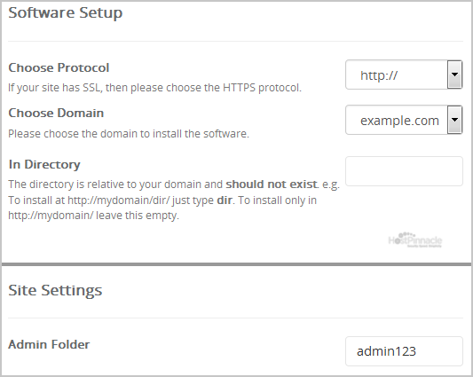 - In Directory: If you want to install this in a directory, for example example.com/directory, enter the directory name. Otherwise, leave this blank to install in your main domain example.com