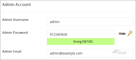 8. Under the "Admin Account" field enter the following information: