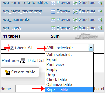 5. Scroll down and mark "Check All" then click on the Drop-down option and select "Repair table".