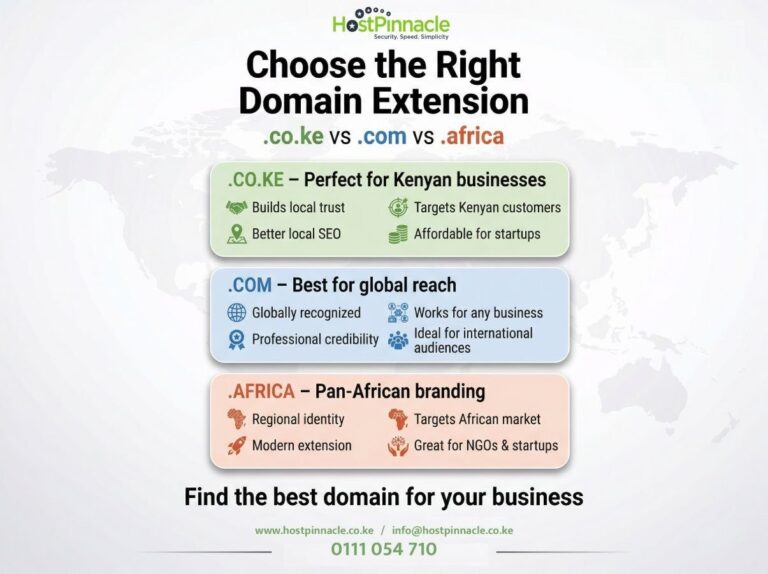 When launching a website, one of the most important decisions you’ll make is choosing the right domain name. But beyond the name itself, the domain extension the part that comes after the dot plays a huge role in how your brand is perceived online. For businesses in Kenya, the most common options are .co.ke, .com, and .africa. Each carries unique advantages, and the right choice depends on your goals. Why Domain Extensions Matter Your domain extension signals credibility, location, and sometimes even the purpose of your website. Customers often judge a site’s trustworthiness based on its extension. For example: Local customers may trust a Kenyan extension more. Global audiences may expect a .com. Regional branding may benefit from .africa. 🇰🇪 The Case for .co.ke Local trust: A .co.ke domain instantly tells visitors your business is Kenyan. SEO advantage: Search engines often prioritize local domains for users in that country. Affordability: HostPinnacle offers .co.ke domains at competitive prices, making them ideal for startups. Best for: SMEs, local shops, schools, and service providers targeting Kenyan customers. The Case for .com Global recognition: .com is the most widely used extension worldwide. Professional appeal: It signals credibility and is often the default choice for established businesses. Flexibility: Works for any type of business, from e-commerce to blogs. Best for: Companies with international ambitions, tech startups, and export businesses.  The Case for .africa Regional identity: Perfect for businesses that want to showcase their African roots. Pan-African branding: Appeals to audiences across multiple African countries. Modern appeal: A newer extension that signals innovation and inclusivity. Best for: NGOs, pan-African enterprises, and brands with a continental vision. How to Decide Ask yourself: Where is my audience? If mostly Kenyan, go with .co.ke. Do I want global reach? Choose .com. Am I building a regional identity? .africa is a strong option. Many businesses register multiple extensions to protect their brand. For example, you could own mybusiness.co.ke, mybusiness.com, and mybusiness.africa—all pointing to the same site.  HostPinnacle Makes It Easy At HostPinnacle, we provide affordable domain registration for .co.ke, .com, .africa, and many more extensions. Whether you’re a startup or a growing enterprise, securing the right domain is the first step toward building a strong online presence. Ready to register your domain? Visit HostPinnacle today and claim your perfect name before someone else does.